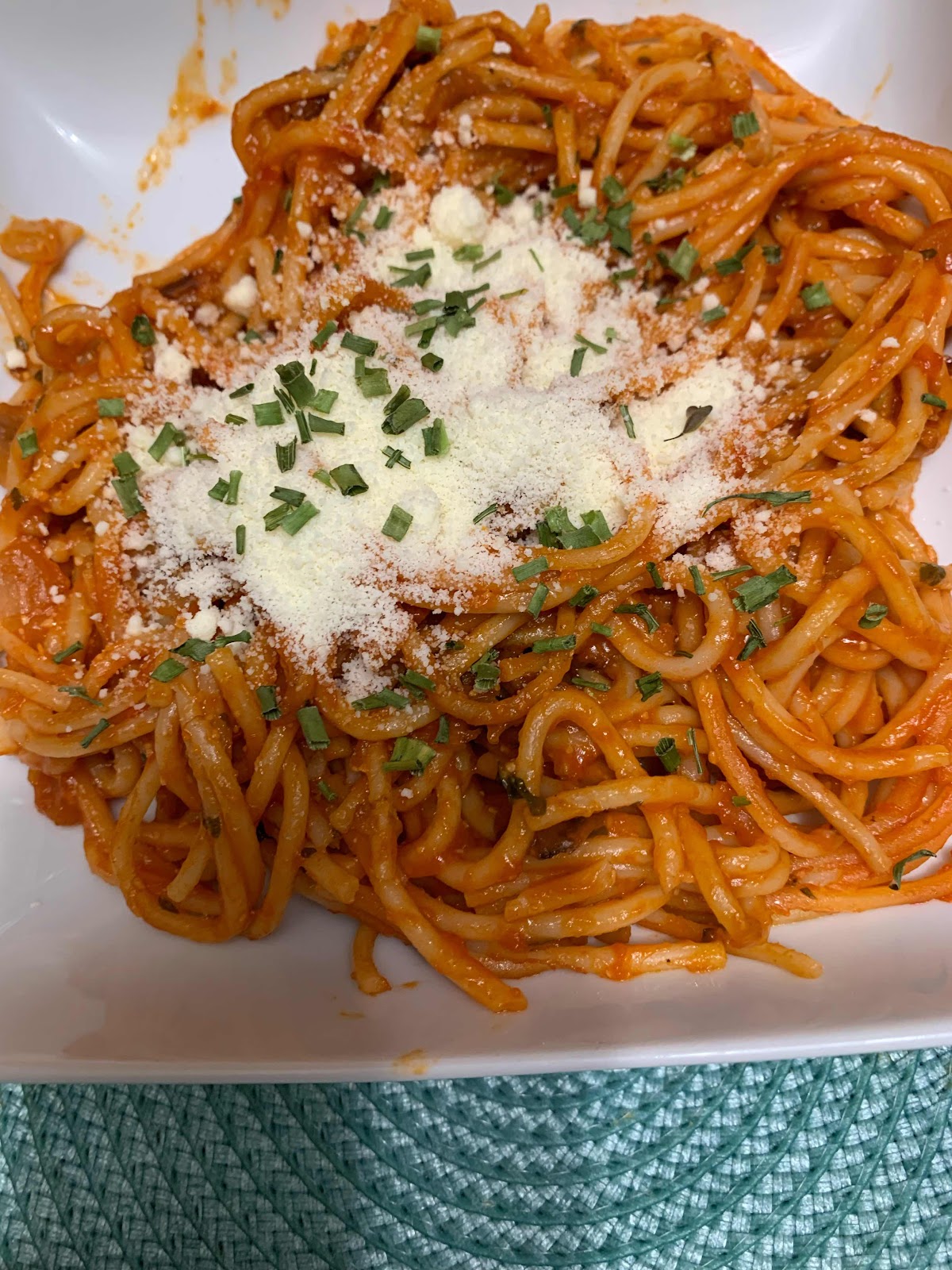 En una sartén se pone la cebolla picada cuando esté bien pochada se echan los espaguetis bien escurridos y se rehoga 5 minutos y al final se pone el tomate frito se da unas cuantas vueltas y se sirve con queso rayado y cebollino